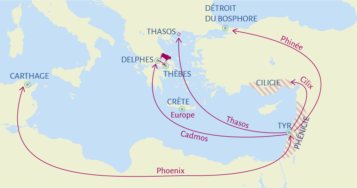 Phoenix part d’abord vers l’ouest, jusqu’à Carthage avant de revenir sur ses pas et donner son nom à la région qui l’a vu naître : la Phénicie. Cilix, lui, part vers le nord, il arrive au sud de l’actuelle Turquie et, ne trouvant pas sa sœur, il s’y installe. Il lui donne son nom et fonde la province de Cilicie. Devant le fiasco des expériences terrestres de ses frères, Thasos explore la mer Égée et découvre au nord une belle île toute ronde et surtout remplie d’or. Il oublie vite sa sœur pour s’y établir. Cette pépite s'appellera désormais Thasos, comme lui. Phinée, le petit dernier atterrit dans la péninsule qui sépare la mer de Marmara et la mer Noire, là où se trouve l’actuel détroit du Bosphore. Le pauvre n’a pas fait le bon choix, il y sera tourmenté par les harpies. D’ailleurs, contrairement à ses frères, la région ne portera pas son nom.