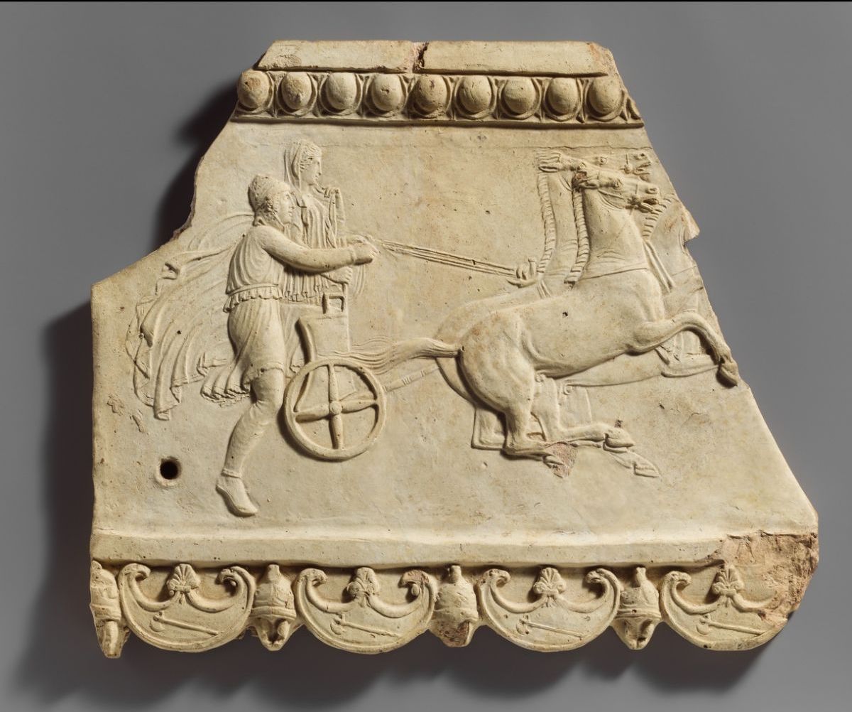 Un récit souvent évoqué est celui du héros Pélops, ancêtre des Atrides qui donna son nom au Péloponnèse. Amoureux de la princesse Hippodamie, il demande sa main à son père Oenomaos, roi d’Elide, à l’ouest du Péloponnèse actuel. Seulement, le souverain n’a nulle intention de laisser partir sa fille chérie si aisément. Dans l’espoir de contrarier toute velléité chez ses prétendants, il édicte une loi : seul celui qui pourra le battre lors d’une course de char aura le droit de prétendre au mariage. Gare aux perdants ! Ils seront décapités par Oenamos lui-même. Mais notre héros-amoureux ne se dérobe pas et accepte le défi. Courageux mais pas téméraire, Pélops se rapproche d’abord de Myrtilos, l’écuyer d’Oenamos et le convainc de l’aider. Celui-ci accepte, négociant au passage la moitié du royaume et une nuit avec Hippodamie* et change une pièce du char du roi par de la cire. Au premier tour de piste, celle-ci fond et le roi se retrouve traîné par ses chevaux avant de mourir sous les yeux horrifiés de sa fille. Pour se faire pardonner de sa trahison, Pélops institue alors les Jeux Olympiques. L’histoire ne dit pas si Hippodamie fut touchée par ce geste mais on se permet d’en douter.
